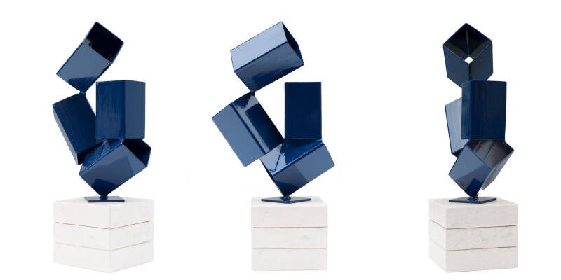 Canduela’s latest series, La Serie de Espacios Cúbicos (Cubic Spaces), exemplifies his commitment to experimentation and precision. Comprising ten unique sculptures, the series is crafted from welded and painted steel mounted on stone bases. The artworks explore the interplay between individual cubic forms and their combined sculptural presence. Through rotations, movements, and assembly, the pieces transform into intricate, multifaceted structures with dynamic perspectives.