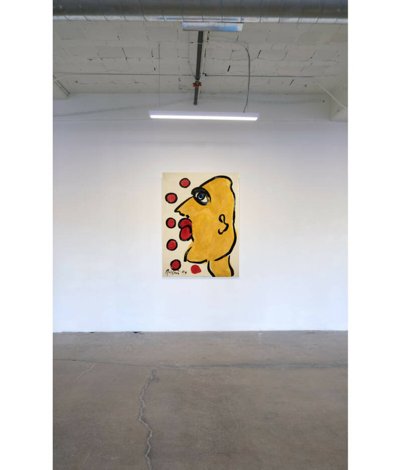 "Portrait in yellow" dates back to 1994 and carries all of the elements of Keil's style. The work is supported by a 74 x 100 cm canvas. The central element is the oversized head, which mainly on the right half in a strong yellow takes up most of the canvas. On the left half of the work there are six red colored circles which, except for one, are limited by a black border. The work is signed and dated lower left on the front.